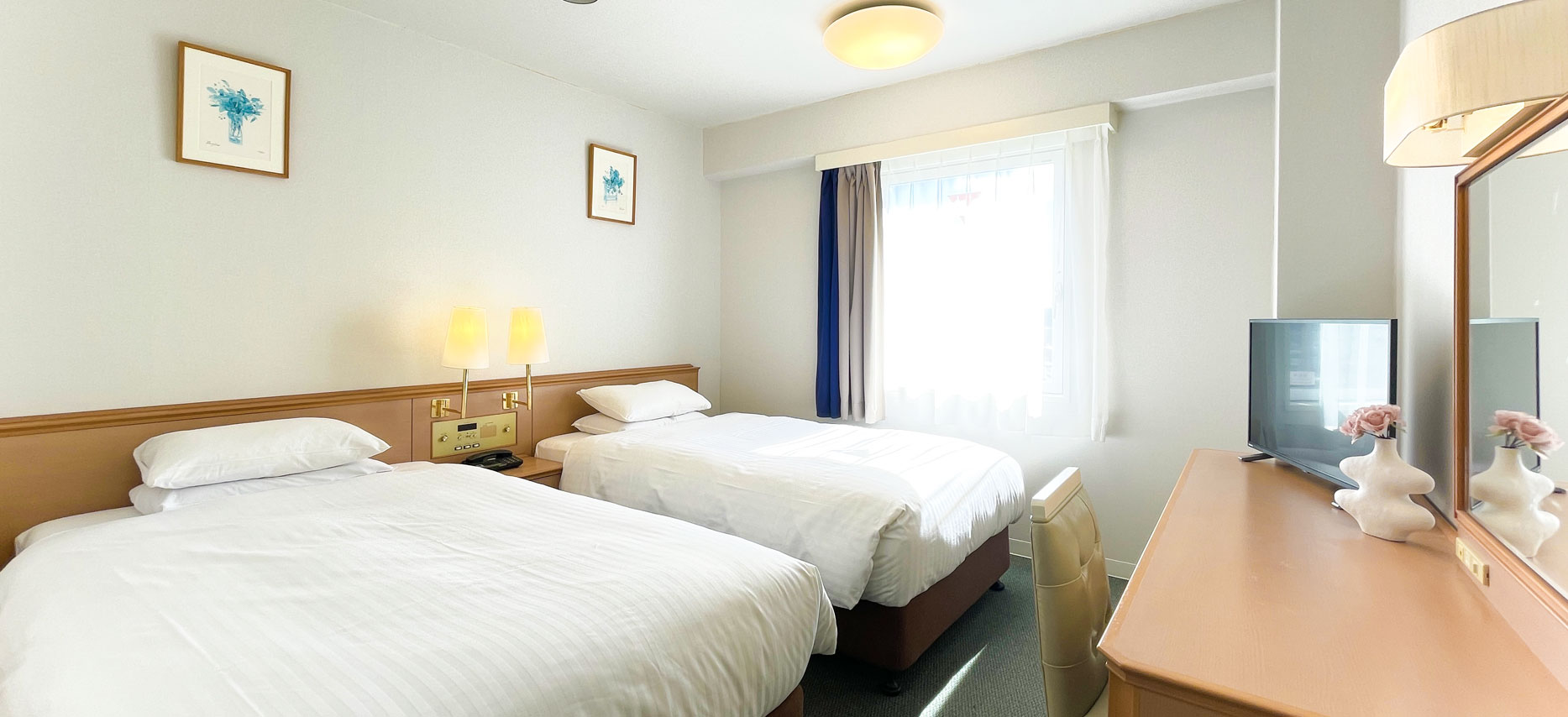 喫煙・禁煙タイプのお部屋をご用意しております。広さ 約18.4平米 ベッドサイズ 1100×1950(mm) アメニティ 共通(ページ下部記載) -
