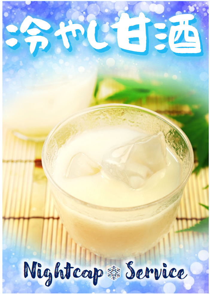 大好評のナイトキャップサービスにて、甘酒の提供を開始致しました。この時期ならではの「冷やし甘酒」をぜひご賞味下さい♪