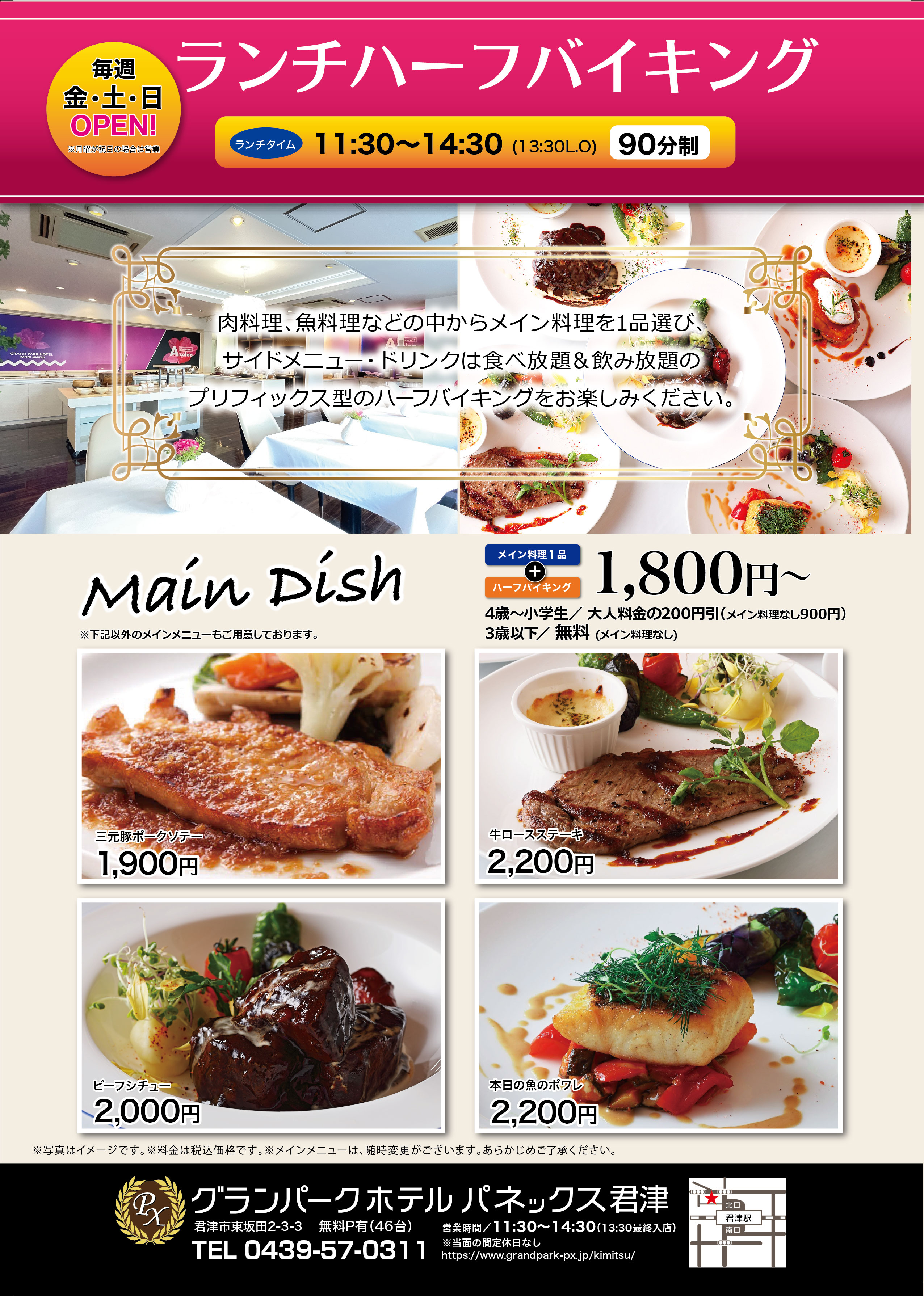 シェフ自慢のメイン料理1品+サラダバー、お料理・デザートビュッフェ、ドリンクバーが付いたハーフバイキングスタイルのランチとなっております。(90分制)